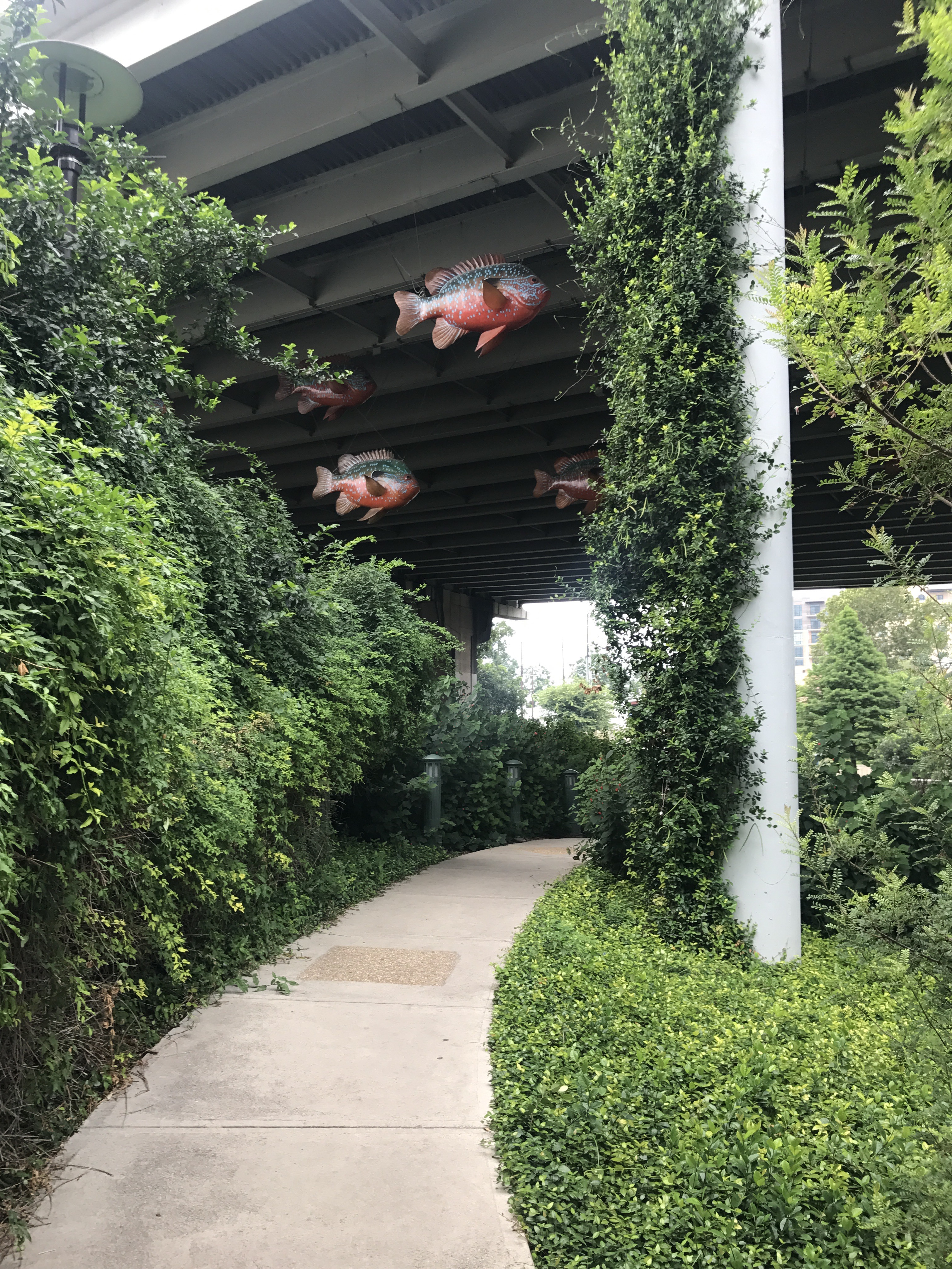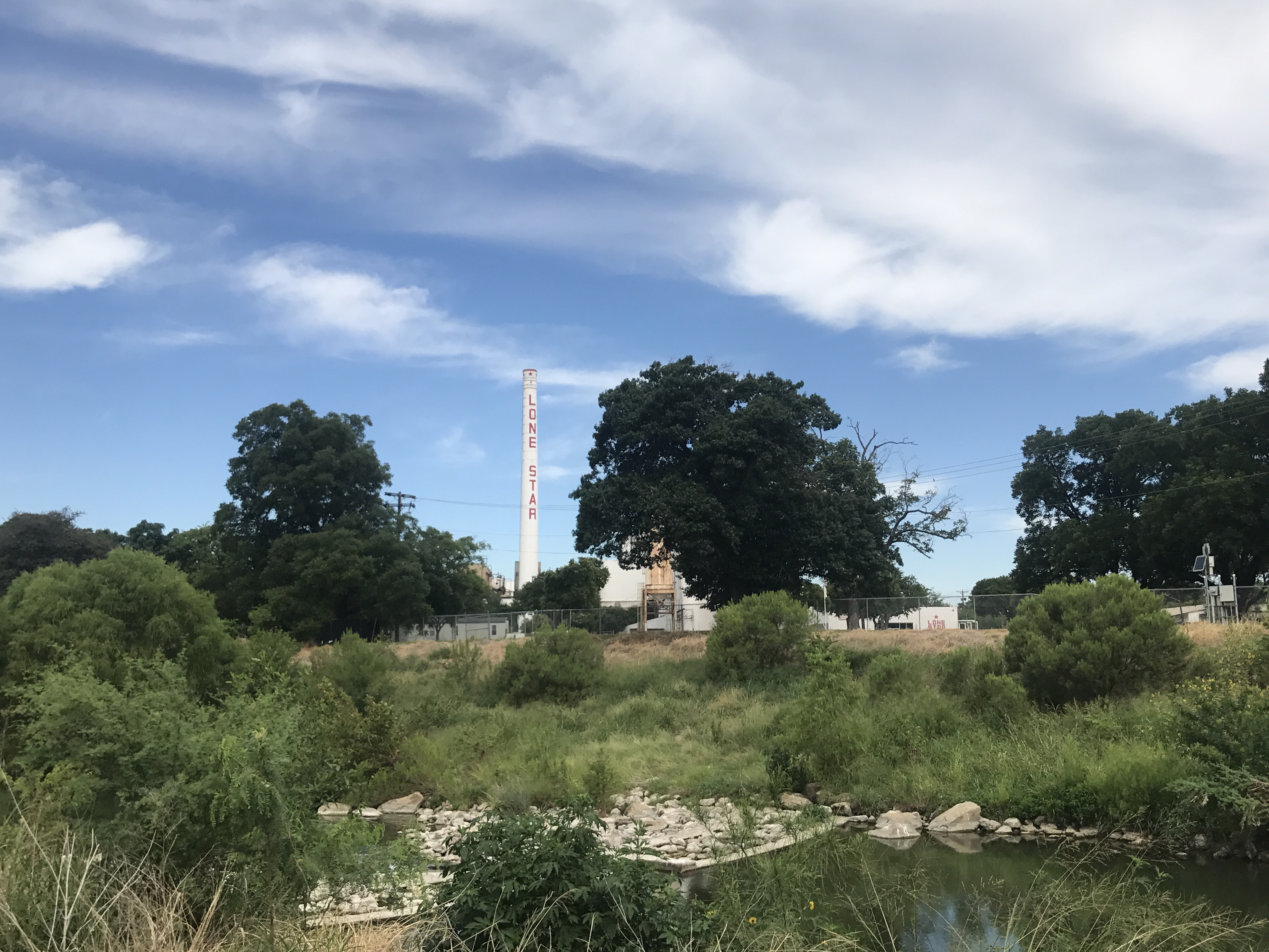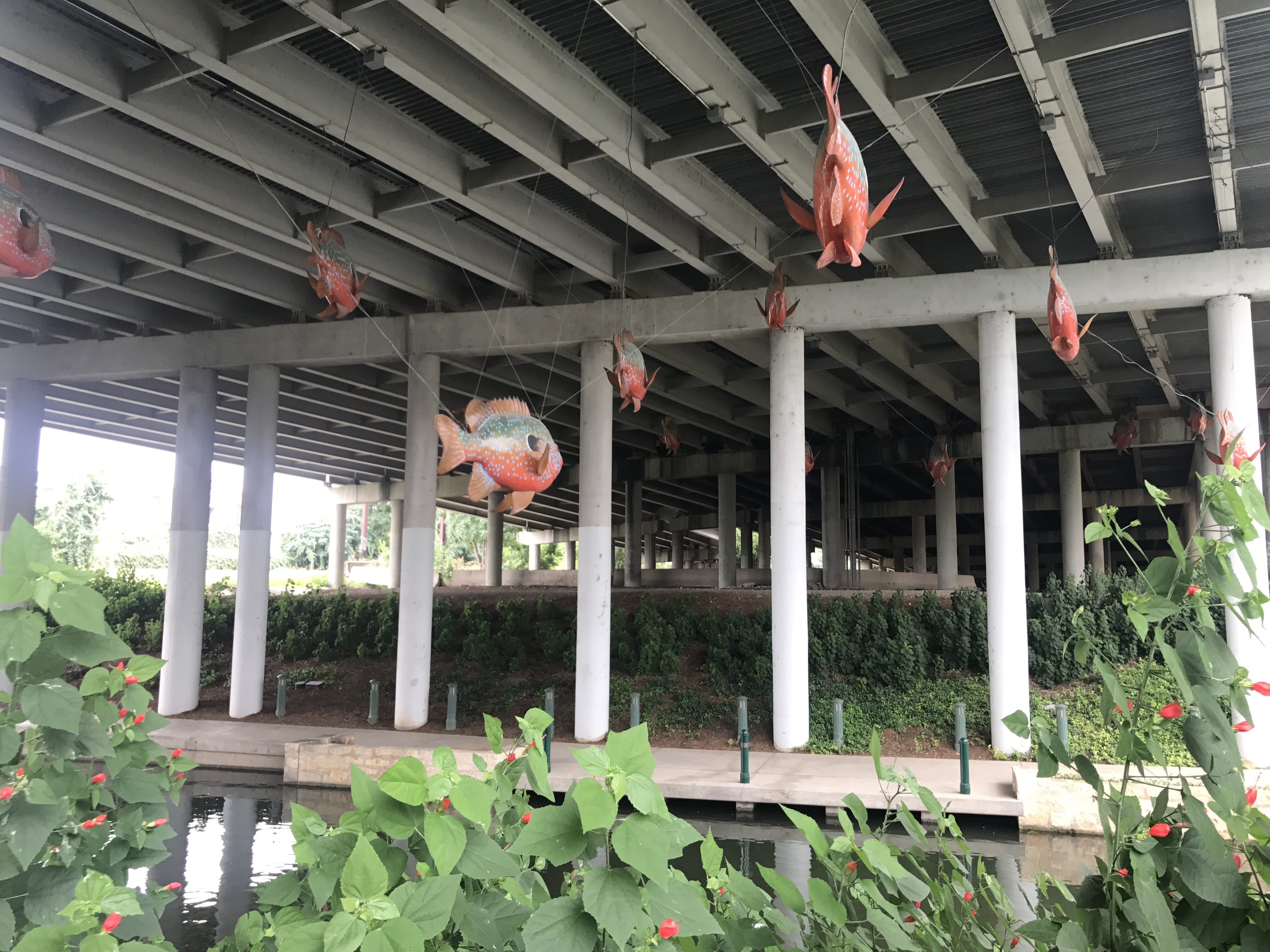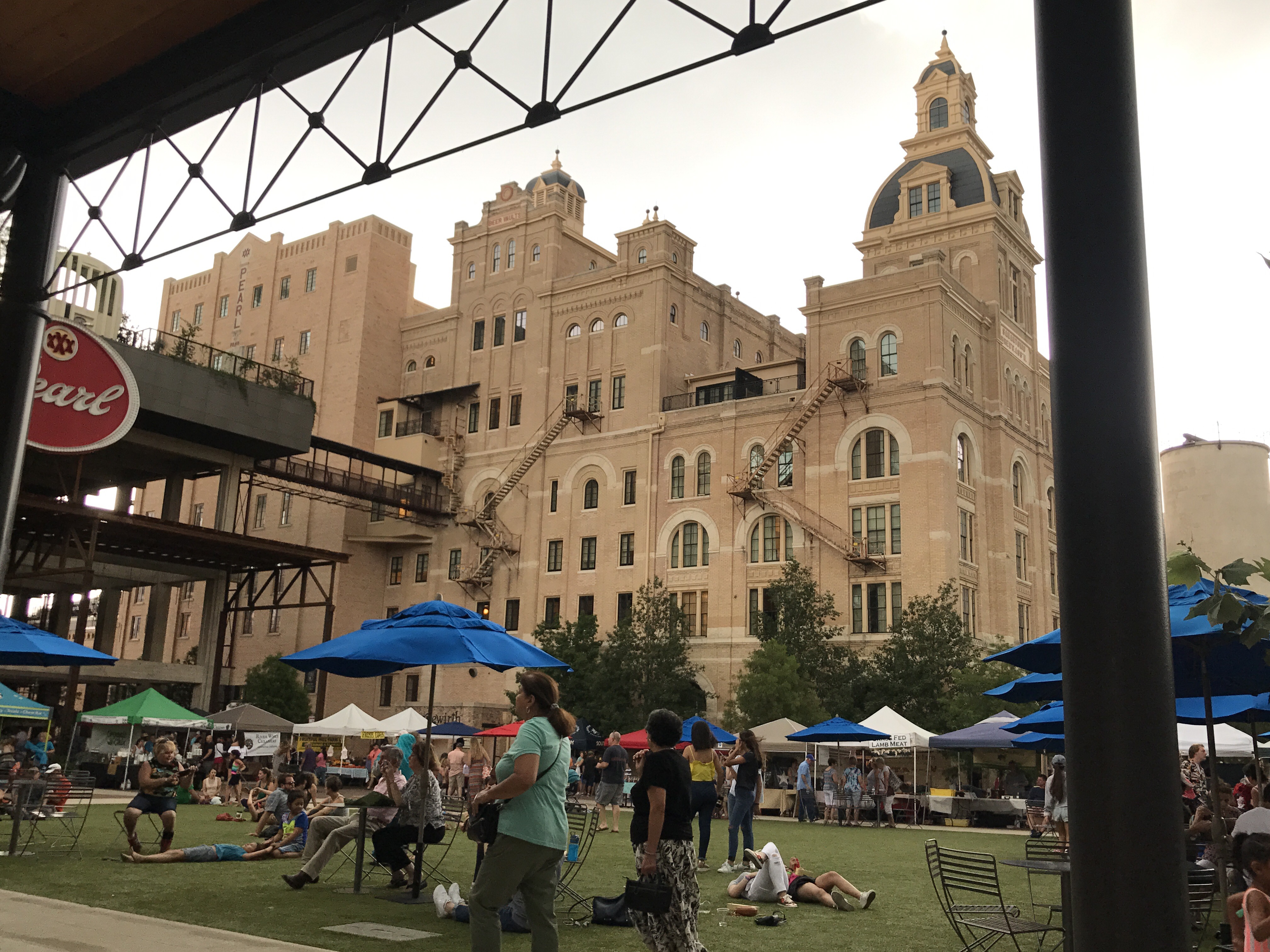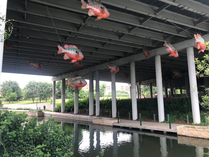 To the north of downtown — the Museum Reach, completed in 2009 — are beautifully landscaped gardens, several museums, entertainment neighborhoods such as the Pearl District, several large community spaces and parks, and several art installations such as the flying fish in several photos below. As for the museums, the the San Antonio Museum of Art is definitely worth a visit, both for its unusual architecture (it’s in the original Lone Star Brewing complex built in 1884) and its many fine collections, in particular the Latin American folk art exhibit. The Witte Museum and Brackenridge Park at the northernmost end of the River Walk both get good reviews; unfortunately, a line of thunderstorms hit that caused me to call an early to end my explorations. On the plus side, those storms forced me to the Pearl District to seek shelter, and it was there that I happened upon an upscale pop up market where I sampled beer, wine, and cheeses, and spotted a number of interesting food trucks and restaurants, though I did not partake of any.